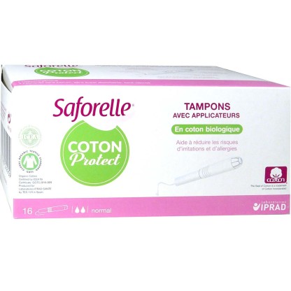 Afin de répondre aux besoins spécifiques de la sphère intime féminine, SAFORELLE a développé une gamme de protections périodiques conçus avec du coton biologique, destinés à prendre soin de la flore vaginale : COTON PROTECT. Les Tampons Coton Protect sont particulièrement adapté aux flux normaux. Grâce au voile protecteur en coton biologique avec son cœur absorbant et l’applicateur au bout arrondi, ils s’insèrent facilement et limite les irritations grâce à sa composition en coton biologique. Le cordon permet d’être retiré facilement et sans douleur. Hypoallergéniques, les tampons prennent soin de la flore intime et limite les irritations et allergies.