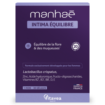 MANHAE Intima équilibre est composé de vitamines B2 et B8 qui participent au maintien d'une peau et de muqueuses normales, de vitamine D qui assure le maintien du bon fonctionnement du système immunitaire, de la vitamine C, du Zinc qui favorise le maintien d'une peau normale et de l’EPA et du DHA (Oméga-3). Enfin la formule est complétée par de la vitamine E qui contribue à protéger les cellules contre le stress oxydatif.