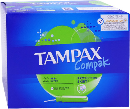 La marque TAMPAX 1ère marque de tampons, propose une large gamme de tampons répondant à tous les besoins hygiéniques en matière de taille, d’intensité de flux, avec ou sans applicateur… Dotés d’un voile protecteur absorbant, les tampons TAMPAX Compak Super s’insèrent tout en douceur et se mettent en place facilement, tout en retenant le liquide à l’intérieur du tampon pour une sécurité maximale. Il est doté d’une jupette anti-fuite à la base du tampon qui prévient les fuites pour une utilisation optimale. L’applicateur permet une insertion plus facile, et le cordonnet un retrait tout en douceur. Leur format compact rétractable permet une utilisation en toute discrétion.