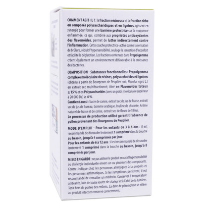 Propolgemma comprimés pour enfants est recommandé pour calmer les maux de gorge ainsi que les problèmes de la cavité buccale, notamment les stomatites, aphtes et gingivites, qui s'accompagnent de sensations de brûlure, de douleurs et de difficultés à avaler. Ce produit peut également servir de protection préventive lors d'expositions à des éléments extérieurs nocifs ou irritants, tels que le froid, la fumée ou la pollution. La fraction résineuse, associée à la fraction contenant des polysaccharides et des lignines, collabore pour créer une barrière protectrice sur la muqueuse enflammée. En parallèle, les propriétés antioxydantes des flavonoïdes contribuent à une action indirecte contre l’inflammation. Cette couche protectrice et active apaise les sensations de brûlure, atténue l’hypersensibilité, soulage l'inconfort et facilite le passage des aliments lors de la déglutition.
