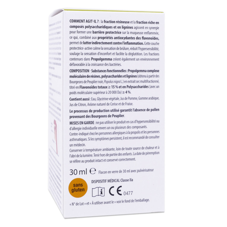 Propolgemma spray sans alcool pour adultes et enfants (dès 3 ans) est recommandé pour calmer les maux de gorge ainsi que les problèmes de la cavité buccale, notamment les stomatites, aphtes et gingivites, qui s'accompagnent de sensations de brûlure, de douleurs et de difficultés à avaler. Ce produit peut également être utilisé en cas de petites lésions buccales dues, par exemple, à des traitements dentaires ou à l’utilisation d’appareils orthodontiques et de dentiers ; et servir de protection préventive lors d'expositions à des éléments extérieurs nocifs ou irritants, tels que le froid, la fumée ou la pollution. La fraction résineuse, associée à la fraction contenant des polysaccharides et des lignines, collabore pour créer une barrière protectrice sur la muqueuse enflammée. En parallèle, les propriétés antioxydantes des flavonoïdes contribuent à une action indirecte contre l’inflammation. Cette couche protectrice et active apaise les sensations de brûlure, atténue l’hypersensibilité, soulage l'inconfort et facilite le passage des aliments lors de la déglutition.