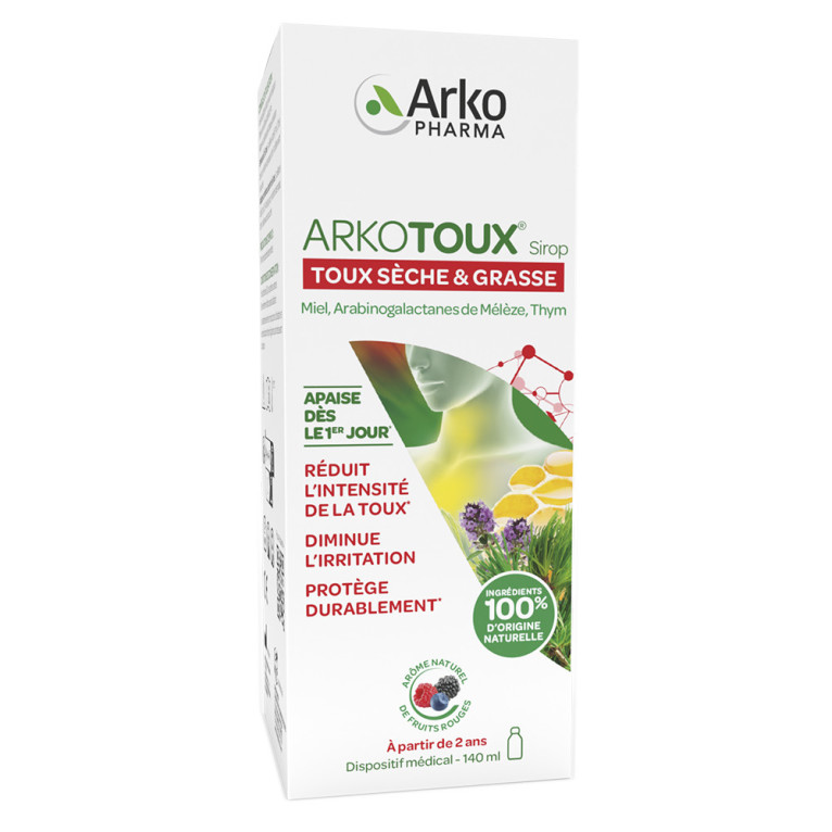 ArkoToux Sirop est un dispositif médical sous forme de sirop à base de plantes composé d’extraits de thym 100% d’origine naturel qui permet grâce à celui ci d'aider en cas de toux sèches mais aussi de faciliter l'expectoration lors de toux grasses. Son goût naturel aux fruits rouges facilitera la prise de ce sirop notamment chez les petits. Sans conservateur, sans colorant.