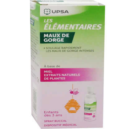 Les laboratoires UPSA développent la gamme LES ELEMENTAIRES pour répondre aux problèmes au niveau de la sphère ORL de toute la famille (rhume, rhinite, mal de gorge,…) par des dispositifs médicaux. Le spray Maux de gorge Enfants est un dispositif médical sous forme de spray à base de glycérol, de miel et d’extraits de plantes. Il va soulager dès la première pulvérisation le mal de gorge et en 2 heures les douleurs intenses au niveau de la gorge grâce à la formation d’un film protecteur sur les parois de la gorge. Testé cliniquement