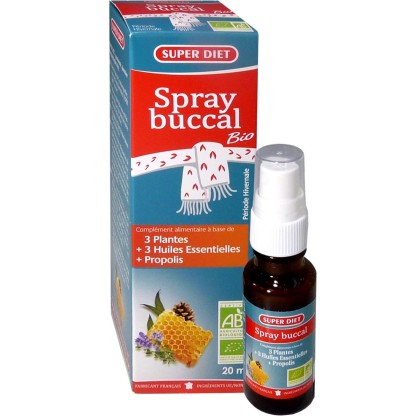 Spray buccal Bio de SUPER DIET, est un complément alimentaire à base de propolis, il est créé par les abeilles à partir de résine végétale, et d'huiles essentiels d'eucalyptus, de lavande et de pin sylvestre. Viennent s'ajouter à ce complément alimentaire de l'eucalyptus du serpolet et du thym.
