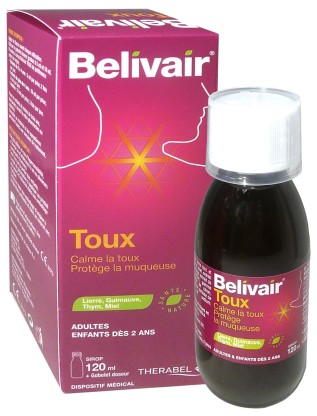 Toux sirop BELIVAIR à prix discount, le dispositif médical sous forme de sirop à base d’extraits de plantes 100% naturels dans votre parapharmacie en ligne discount, qui s’utilise pour soulager toutes les toux sèches, irritations ou grasses. (A partir de 2 ans)