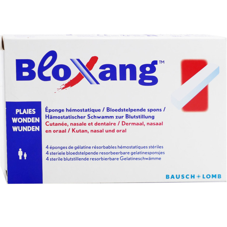 Application : Ne pas appliquer Bloxang® sur une plaie infectée ou des plaies avec exsudats inflammatoires. Ne pas utiliser Bloxang® sur sutures cutanées chirurgicales car le processus de cicatrisation des lèvres de la plaie peut s'en trouver affecté. En cas de saignement du nez chez les nourrissons et les patients présentant des troubles de la conscience Bloxang® doit être utilisé uniquement après avis médical. Aucun effet secondaire n'est connu à ce jour. Ne pas appliquer en cas de détérioration de l'emballage, la stérilité n'étant plus garantie. Bloxang® ne doit pas être restérilisé, ni réutilisé. Sortie du conditionnement : Dans un premier temps, détacher une compresse du blister au niveau des perforations. Oter le film protecteur avec précaution en tirant sur la languette signalée par une flèche. L'éponge de gélatine stérile peut alors être sortie en respectant les règles d'asepsie.