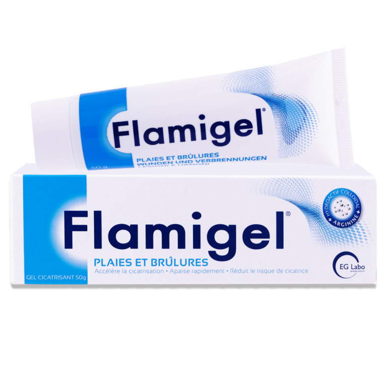 FLAMIGEL Plaies et brulures associe un hydrocolloïde à de l’arginine dans un gel pour soulager la douleur et accélérer le processus de cicatrisation en absorbant l’excès de liquide et en hydratant en profondeur la plaie. Il va former un film protecteur sur la plaie afin de réparer rapidement la peau. Ce gel cicatrisant et apaisant peut être appliqué sur une plaie sèche ou humide. Avec un effet froid, la douleur est apaisée rapidement. Non gras et non collant FLAMIGEL ne tache pas.