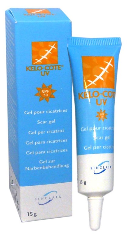 KELO-COTE UV de SINCLAIR, le gel silicone breveté à haute protection solaire, pour prévenir et traiter les cicatrices hypertrophiques et chéloïdes suite à des interventions chirurgicales, des traumatismes, des plaies ou des brûlures.