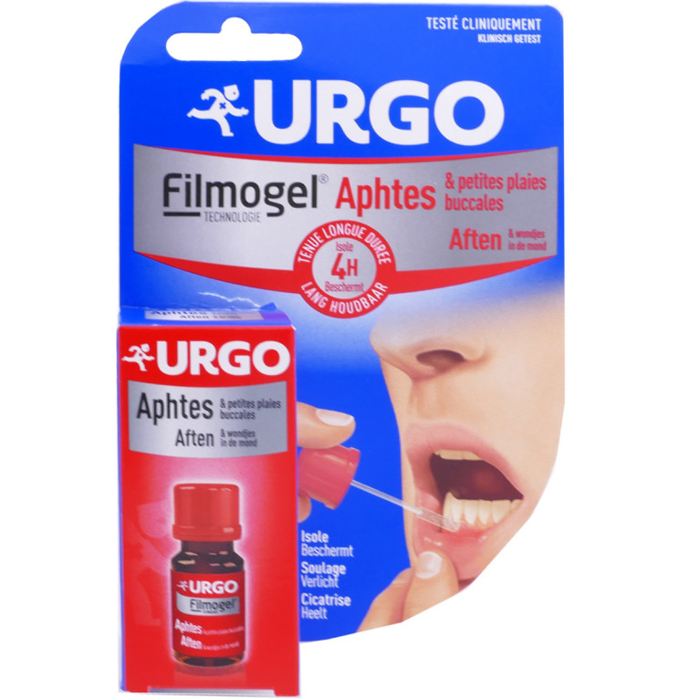 FILMOGEL Aphtes et petites plaies buccales des laboratoires URGO est un dispositif innovant, un traitement liquide qui se transforme au contact de l’air en film fin et souple, résistant à l’eau pour protéger et isoler les lésions mineures de la bouche notamment les aphtes. Il protège efficacement la plaie des aliments et de la salive pendant 4 heures, soulage la douleur et favorise une cicatrisation rapide des aphtes et autres petites plaies.