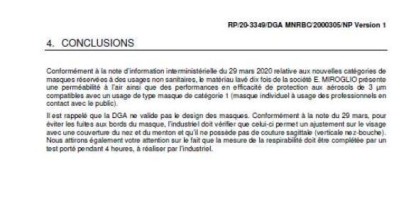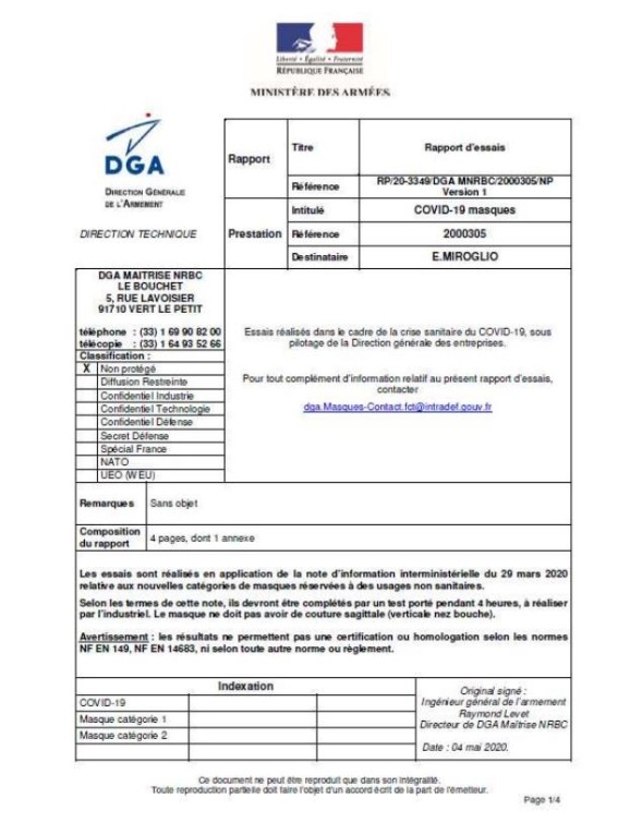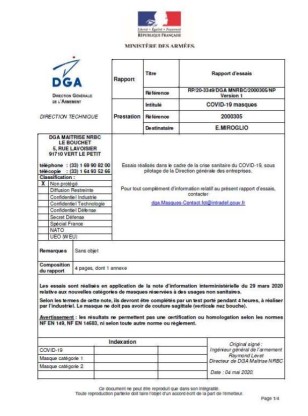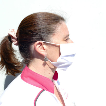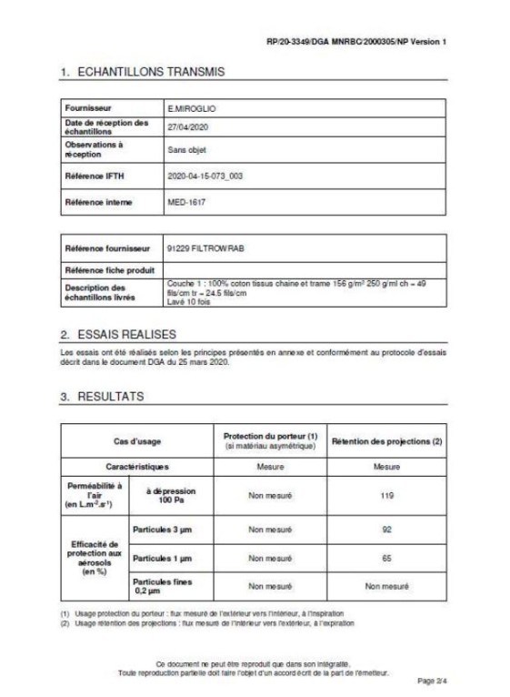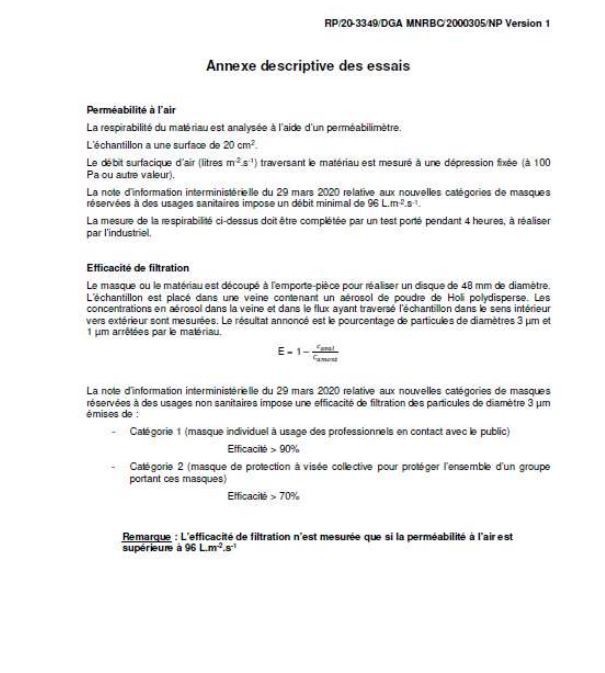 Le masque lavable en tissus (coton et élasthane) est un masque qui a été testé. Il a démontré que son matériau a une perméabilité à l’aire et des performances en efficacité de protection aux aérosols de 3µm semblable à l’usage d’un masque de type masque de catégorie 1 (masque de protection à visée professionnelle pour protéger les professionnels lors de contact avec le public). Il est réutilisable et lavable jusqu’à 10 fois.