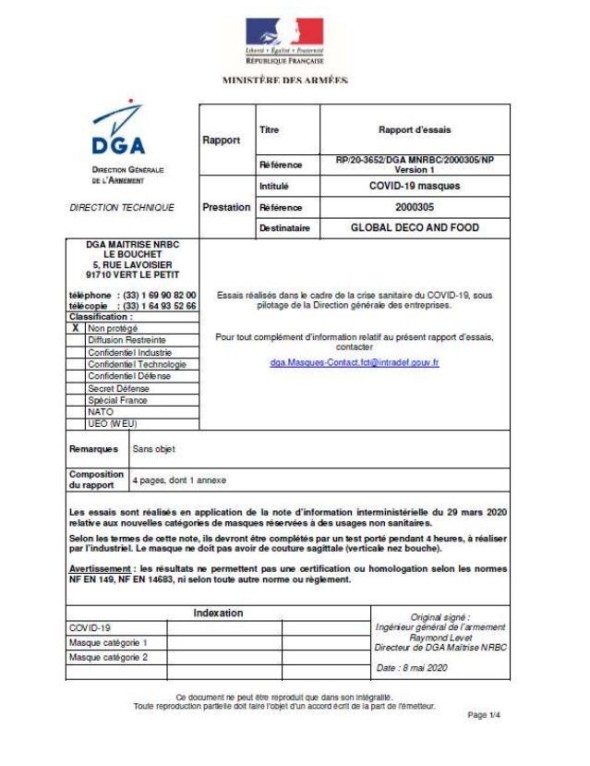 Le masque lavable en tissus (coton et élasthane) LMC est un masque qui a été testé. Il a démontré que son matériau a une perméabilité à l’air et des performances en efficacité de protection aux aérosols de 3µm semblable à l’usage d’un masque de type masque de catégorie 2 (masque de protection à visée collective pour protéger l’ensemble d’un groupe portant ces masques). Il est réutilisable et lavable jusqu’à 10 fois.