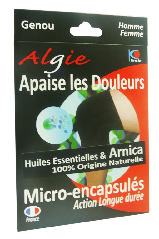 ALGIE « Apaise les douleurs » sont des solutions naturelles à base d’huiles essentielles et d’extrait d’arnica sous forme d’orthèse, genouillère, chevillière,… pour soulager diverses douleurs par des fibres synthétiques en polyester. La genouillère est composée d’une fibre polyester qui contient de la zircone (oxyde de zirconium) à l’effet thermique, des microcapsules composées d’huile essentielle de gaulthérie et des extraits d’arnica pour des actions antalgiques et antiinflammatoires. En se libérant au contact de la peau par frottements, ces actifs d’origine 100% naturels vont soulager les douleurs rapidement au niveau du genou pour retrouver de la mobilité sans souffrance. Confortable, la genouillère qui a un maintien élastique pour s’adapter au corps, peut être portée jour et nuit pour une efficacité durable sous une attelle d’immobilisation, avant pendant ou après un effort. Pratique, la genouillère de couleur noire peut être lavé à 40°C pour une utilisation longue durée, être séché sur cintre, et rechargé