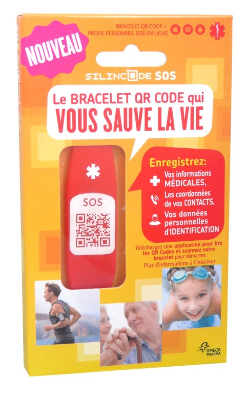 Le groupe Omega Pharma, acteur européen incontournable sur le marché des produits de santé familiale et de bien-être, développe de nombreuses marques reconnues pour la qualité, la sûreté et l’efficacité de leurs produits. Le bracelet SILINCODE SOS permet grâce à la technologie QR CODE d’enregistrer les informations médicales principales de la personne (âge, allergies, traitement médical,…) afin de faciliter les démarches de soin d’un médecin ou de personnel de santé. Attaché au poignet, il est facile d’utilisation : en scannant le QR Code du bracelet avec un smartphone ou une tablette, toutes les informations santé s’affichent à l’écran. Lorsqu’une personne scanne le QR Code, le contact enregistré reçoit par mail 2 messages : l’information que le bracelet a été scanné, et la géolocalisation approximative d’où le bracelet a été scanné.