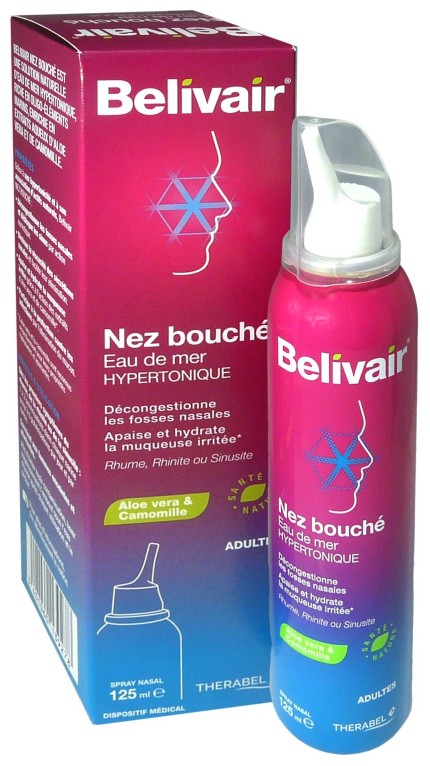 Nez bouché Eau de mer hypertonique BELIVAIR à prix discount, un dispositif médical sous forme de spray dans votre parapharmacie en ligne discount, pour libérer les voies respiratoires nasales lors de nez bouché (rrhumes, hinites, sinusites) chez toute la famille à partir de 6 ans.