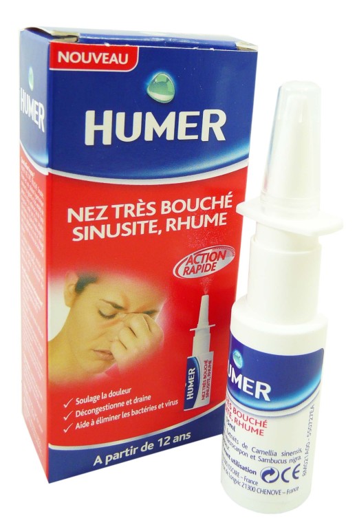 Le spray Nez très bouché de HUMER, un dispositif médical pour libérer les voies respiratoires nasales lors de nez très encombré (rhume, sinusites,…) de toute la famille (à partir de 12 ans).