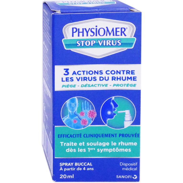 Le laboratoire Sanofi a conçu des compléments alimentaires, médicaments et dispositifs médicaux pour soulager différents problèmes : antalgie, dermatologie, circulation, ORL,… adaptés à toute la famille. PHYSIOMER STOP VIRUS est un dispositif médical en spray facile à utiliser qui permet de piéger le virus du rhume en créant grâce au glycérol une barrière osmotiquement active; désactiver son infectiosité grâce à la trypsine, protégeant ainsi la cavité orale et la gorge .