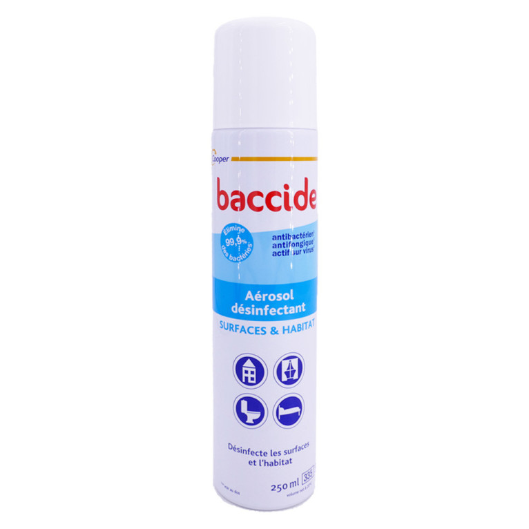 BACCIDE AEROSOL DESINFECTANT SURFACES & HABITAT en vente en ligne sur le site de votre parapharmacie à prix discount est un produit indispensable pour assurer une hygiène optimale de votre environnement. Ce désinfectant est efficace contre les bactéries, les virus et les champignons.