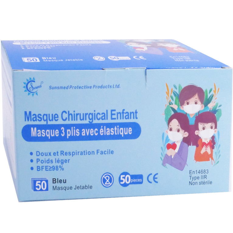 Masque Enfant Chirurgical Sunsmed type IIR conforme a la norme EN 14683 discount, la solution santé à prix discount dans votre parapharmacie en ligne, un dispositif médical à fixation auriculaire anti-projection, contre la transmission de bactéries entre soignant/patient et lors d’une chirurgie.