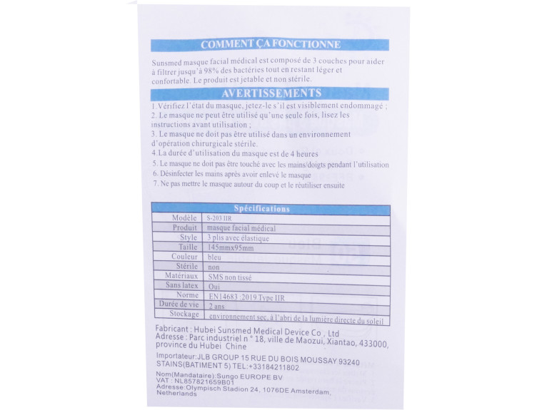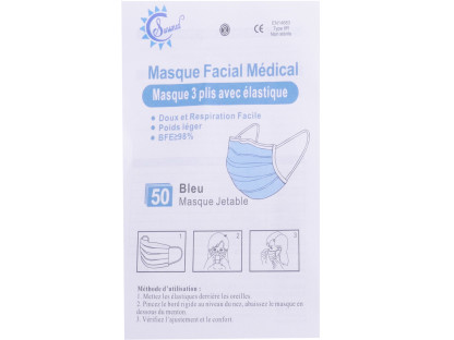 Les Masques facial de protection Sunsmed sont non tissés, et à haute filtration (>98% sur les bactéries) grâce aux 3 couches. Ils sont à utiliser en cas de maladie infectieuse afin de prévenir la contamination et protéger contre les gouttelettes, et pendant une opération chirurgicale. Ils ont été développés afin d'assurer un grand confort respiratoire grâce aux 3 plis. Ils sont non stérile et à usage unique. Rapide à mettre et à retirer, les masques possèdent des fixations auriculaires confortables. Les masques sont un Dispositif médical – marquage CE type IIR selon EN14683 : masque chirurgical.