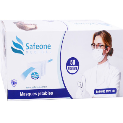 Les Masques facial de protection jetable SAFEONE MEDICAL à haute filtration sur les bactéries, les virus (>98%) et les liquides. Ils sont à utiliser afin de prévenir la contamination et protéger contre les bactéries et virus notamment lors de projection et pulvérisation émis par les autres comme les éternuements et la toux. Ils ont été développés afin d'assurer un grand confort respiratoire grâce aux 3 plis : un pli externe pour protéger des projections de gouttelette, un pli interne pour filtrer les microbes et le dernier pli pour l’imperméabilité aux liquides. Il a également une couche interne pour le confort en contact avec la peau. Ils sont non stérile et à usage unique. Rapide à mettre et à retirer, les masques possèdent des fixations auriculaires confortables sans latex avec leur conception légère. Une barrette d’ajustement nasale permet de bien positionner le masque pour épouser la forme du visage. Les masques sont un Dispositif médical – marquage CE type IIR selon EN14683.