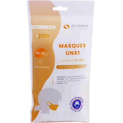 Ce Masque Barrière Réutilisable est un masque non médical UNS 1 lavable et réutilisable 50 fois , au pouvoir de rétention supérieur à 99%. Sachet de 6 masques. Pour les 11-16 ans