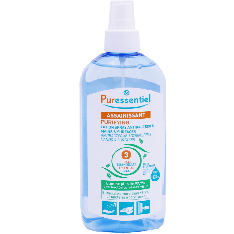 PURESSENTIEL Assainissant Lotion Antibactérien discount, le pouvoir des huiles essentielles dans votre parapharmacie en ligne à prix discount, dans un spray pratique qui nettoie et désinfecte les mains, les objets et les surfaces sans rinçage !