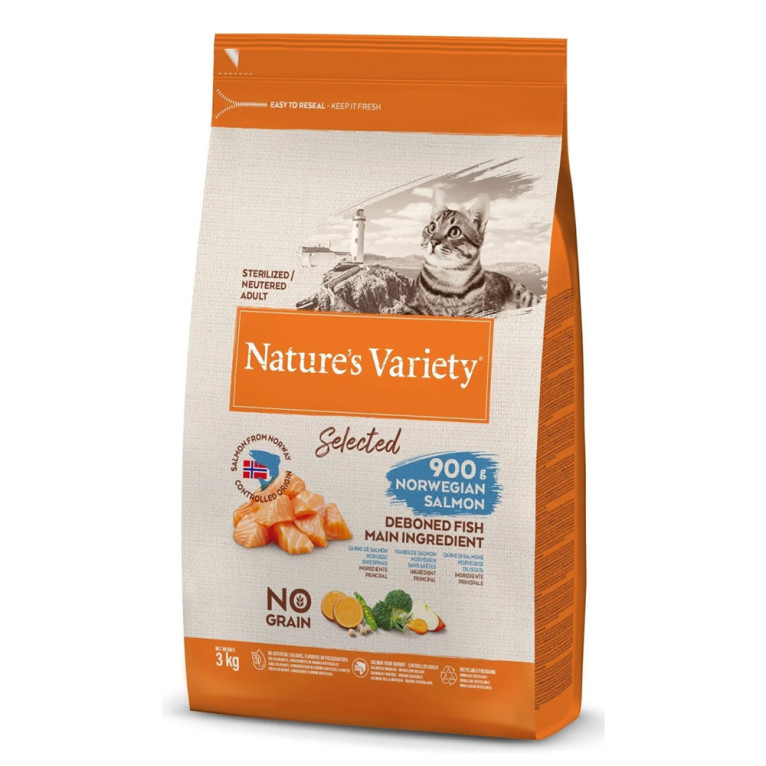Selected No Grain Saumon discount de NATURE’S VARIETY, la santé animale au naturel dans votre parapharmacie en ligne à prix discount, pour un aliment complet délicieux sans céréales ajoutées pour le plus grand plaisir des chats ! Pour chats adultes stérilisés