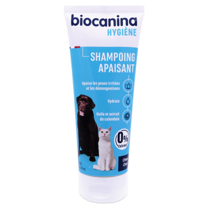 Le laboratoire BIOCANINA a conçu des produits de bien-être, antiparasitaires, hygiène, dermatologiques… spécialement formulés pour les chiens et les chats. Le shampooing Apaisant à la base lavante douce, élimine toutes les salissures tout en douceur, protège et hydrate la peau sensible de l’animal, et apaise de tout inconforts et démangeaisons grâce à l'huile et extrait de calendula. Le poil est propre, la peau est apaisée. Après le shampooing le poil est brillant et doux.
