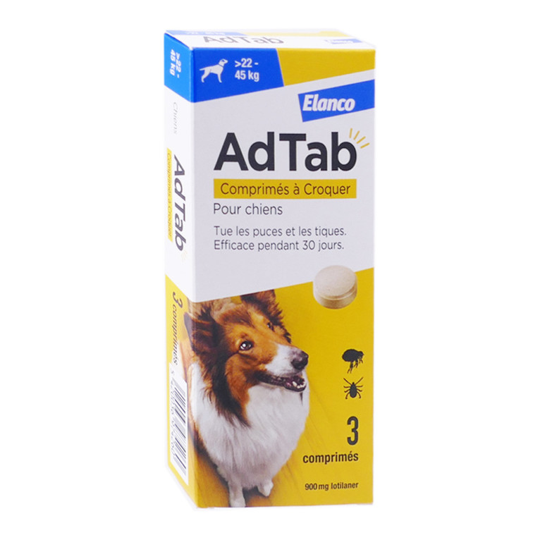 e produit ELANCO ADTAB ANTPARASITAIRE CHIEN 22-45KG 3 COMPRIMES est en vente en ligne sur le site de votre parapharmacie à prix discount. Découvrez un antiparasitaire efficace pour votre chien de 22 à 45 kg.