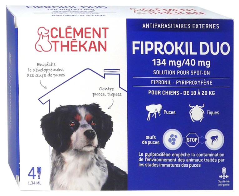 Le laboratoire CLEMENT THEKAN conçoit des produits et soins vétérinaires pour le bien-être des animaux de compagnie (shampooing, traitement puce anti-tique,…). Fiprokil Duo est un médicament vétérinaire anti-parasitaire sous forme de pipettes simple à appliquer, qui agit sur la protection et le traitement des insectes chez le chien pesant entre 10 à 20kg et son environnement. Il permet de tuer les puces et d’éliminer les tiques en limitant la transmission de la maladie de la piroplasmose, et de protéger contre la ré infestation et l’environnement de l’animal grâce au fipronil et à la pyriproxifène. Les chiens sont protégés pendant 5 semaines de toute infestation par les puces, et protégés de la multiplication des puces en luttant contre le développement des œufs de puce pendant 12 semaines. L’animal et son environnement est protégé des infestations des tiques pendant 1 semaine.