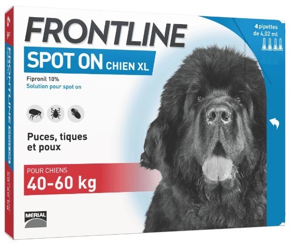 Chiens de 40 à 60 kg : une pipette de FRONTLINE Spot-On XL par animal (4.02 ml). Pour les chiens de plus de 60 kg, appliquer une pipette de 4.02 ml ainsi qu'une pipette du volume inférieur approprié. Le minimum d'intervalle de traitement est de 4 semaines.