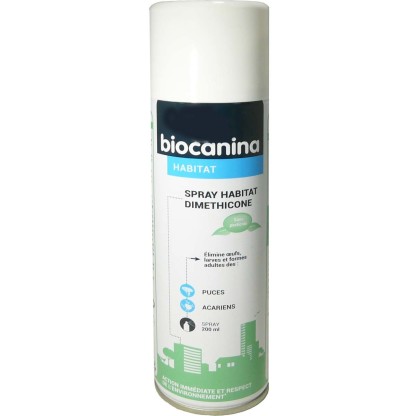 Le laboratoire BIOCANINA a conçu des produits de bien-être, antiparasitaires, hygiène, dermatologiques… spécialement formulés pour les chiens et les chats. Le spray habitat Diméthicone s’utilise en complément des traitements anti-puces et anti-tiques pour débarrasser l’environnement que l’animal occupe de toutes infestations de puces provenant des animaux. Grâce à la diméthicone, il élimine dès la première utilisation les puces à tout stade de développement et empêche d’arriver au stade de l’adulte, ainsi que les acariens, sur toutes les surfaces infestées (paniers des animaux, coussins, moquettes, accessoires, meubles,…) en les enveloppant dans une fine couche afin de les paralyser et les asphyxier. Le spray habitat Diméthicone ne tache pas. L’environnement est débarrassé de tout parasite en seulement quelques minutes.