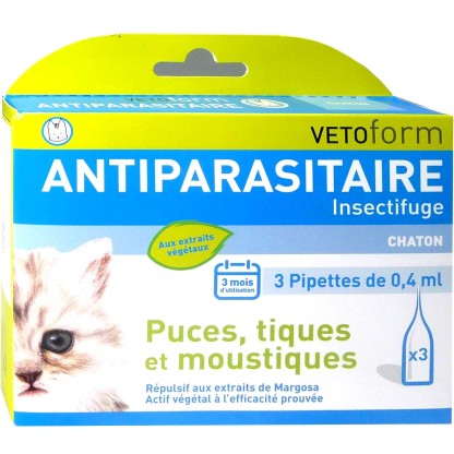 Insectifuge pour chatons de VETOFORM Antiparasitaire discount, un antiparasitaire en pipette dans votre parapharmacie à prix discount, pour une action efficace, naturelle et longue durée sur les parasites du chaton (puces, tiques, moustiques). A partir de 2 mois