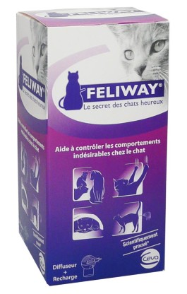 Féliway délivre des phéromones faciales qui apaisent les chats en créant un environnement qui ne les stresse pas. Le produit est inodore, non sédatif et non dangereux pour les humains et les animaux. Le kit Féliway contient une recharge.