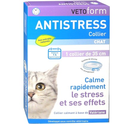 ANTISTRESS Collier de VETOFORM discount, un collier naturel et de longue durée dans votre parapharmacie en ligne à prix discount, qui détend et apaise les chats pouvant être stressés par des changements (déménagement, séparation, arrivée d’un animal ou d’un enfant,…) ou lors de problèmes de comportements (marquage urinaire, comportement destructeur,…) Chats de toute taille et toute race. Taille du collier 35cm