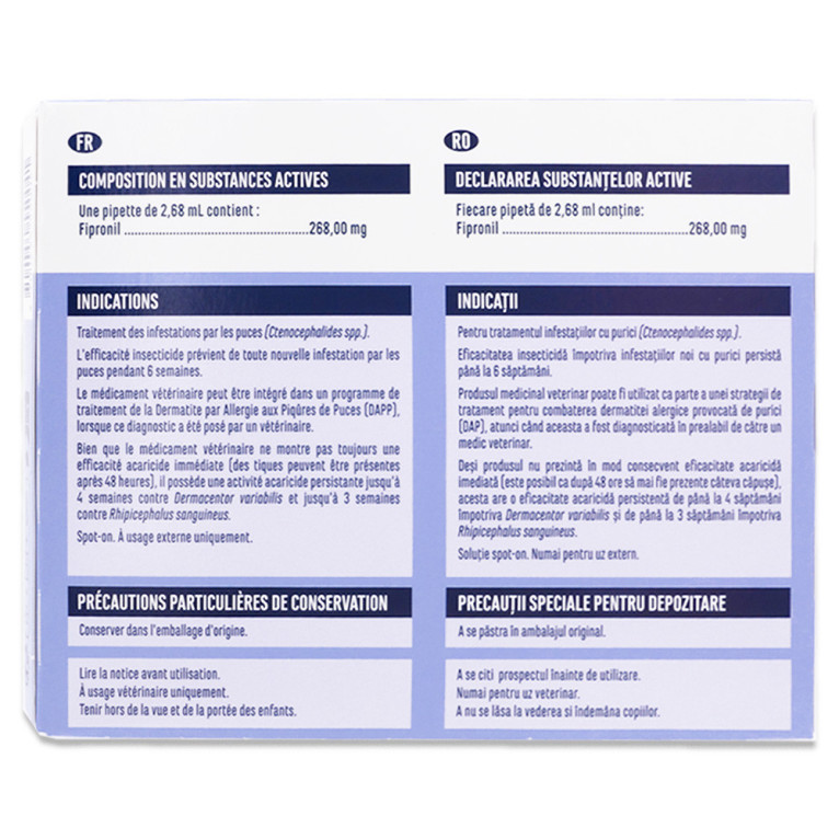 Avant toute utilisation, il est recommandé de lire attentivement la notice d’utilisation ou de se référer aux informations présentes sur l’emballage afin de connaître les précautions d’emploi et les instructions. Appliquer une pipette par mois sur la peau entre les omoplates. Usage externe uniquement. Tenir hors de portée des enfants.