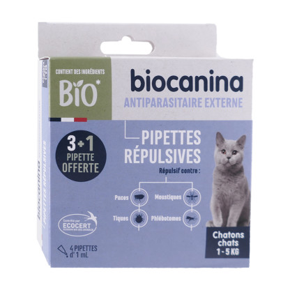 BIOCANINA PIPETTE ANTIPARASITAIRE BIO EXTERNE CHATONS CHATS 1-5KG 4 PIPETTES en vente en ligne sur le site de votre parapharmacie à prix discount. Protégez votre chaton ou chat des parasites avec cette solution naturelle et efficace.