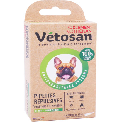 I Pipettes Répulsives VETOSAN discount de CLEMENT THEKAN, l’antiparasitaire naturel dans votre parapharmacie en ligne à prix discount, pour traiter de l’infestation des parasites sur l’animal. Chiot et Petit chien.