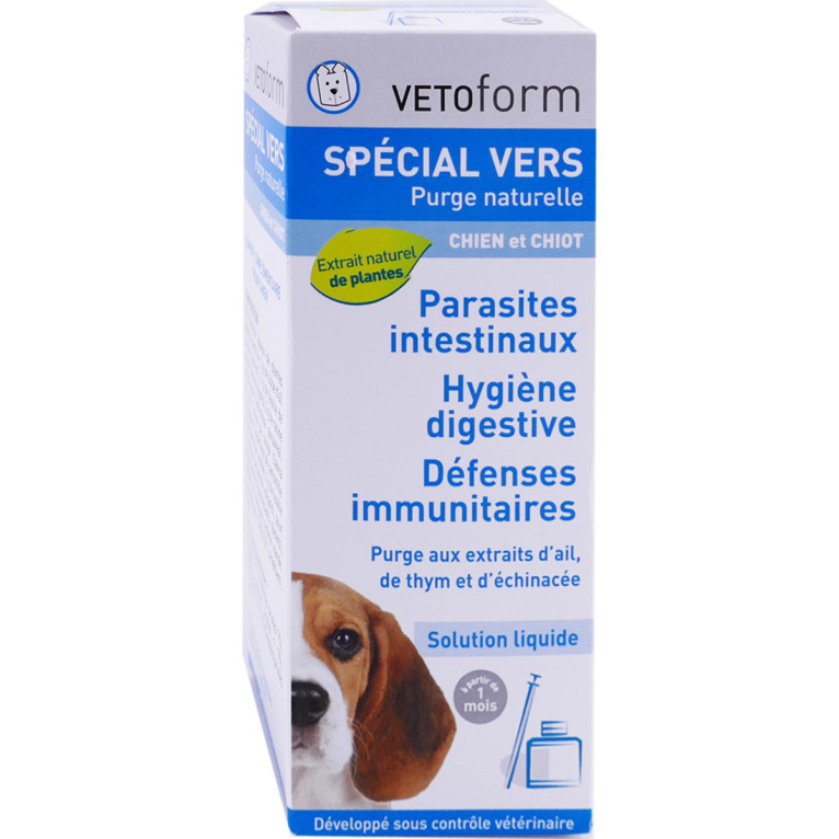 Spécial Vers Purge naturelle de VETOFORM discount, le vermifuge naturel en solution buvable destiné aux chiens et chiots dans votre parapharmacie en ligne à prix discount, pour lutter contre l’infestation des vers et participer au bien-être intestinal de l’animal. Dès l’âge de 2 mois.