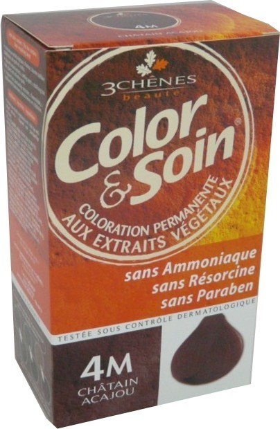 Color & Soins coloration permanente aux extraits végétaux des laboratoires 3 Chênes, efficacité, naturalité et innovation dans une coloration qui offre soin et reflets intenses aux cheveux, protection et douceur aux cuirs chevelus les plus sensibles. 4M Châtain acajou.
