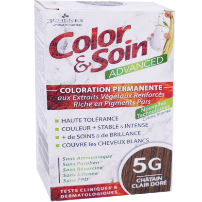 Color & Soins ADVANCED discount des laboratoires 3 Chênes, efficacité, naturalité et innovation dans votre parapharmacie en ligne à prix discount, dans une coloration permanente qui offre soin et reflets intenses aux cheveux, protection et douceur aux cuirs chevelus les plus sensibles. 5G Châtain Clair Doré.