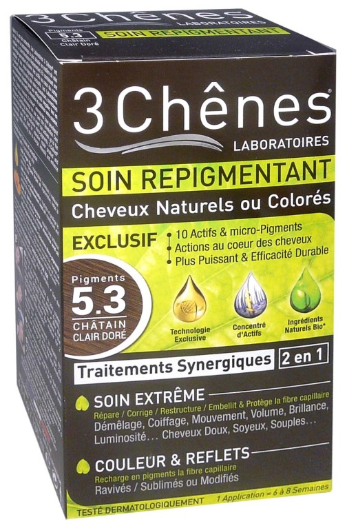 Soin repigmentant des 3 CHENES, une couleur sublime intense et de longue durée pour des cheveux réparés pleins de vitalité et lumineux aux reflets intenses. Pour cheveux naturels, colorés ou méchés. Couleur 5.3 châtain clair dore.