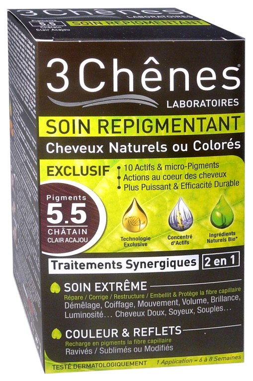 Soin repigmentant des 3 CHENES, une couleur sublime intense et de longue durée pour des cheveux réparés pleins de vitalité et lumineux aux reflets intenses. Pour cheveux naturels, colorés ou méchés. Couleur 5.5 châtain clair acajou