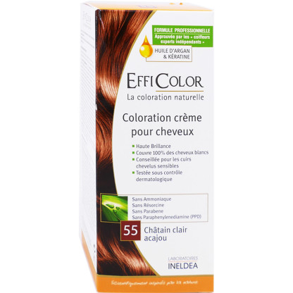 Coloration Capillaire EFFICOLOR Permanente discount d'INELDEA, la coloration haute performance dans votre parapharmacie en ligne à prix discount, pour assurer couleur intense, brillance et protection longue durée, Châtain Clair Acajou 55.