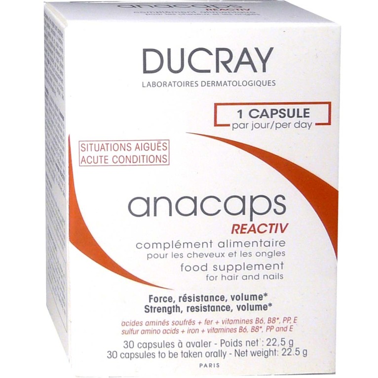 Anacaps Reactiv de DUCRAY discount, le complément alimentaire sous forme de capsules dans votre parapharmacie à prix discount, pour stimuler la repousse des cheveux et des ongles, pour une chevelure dense et des ongles forts.