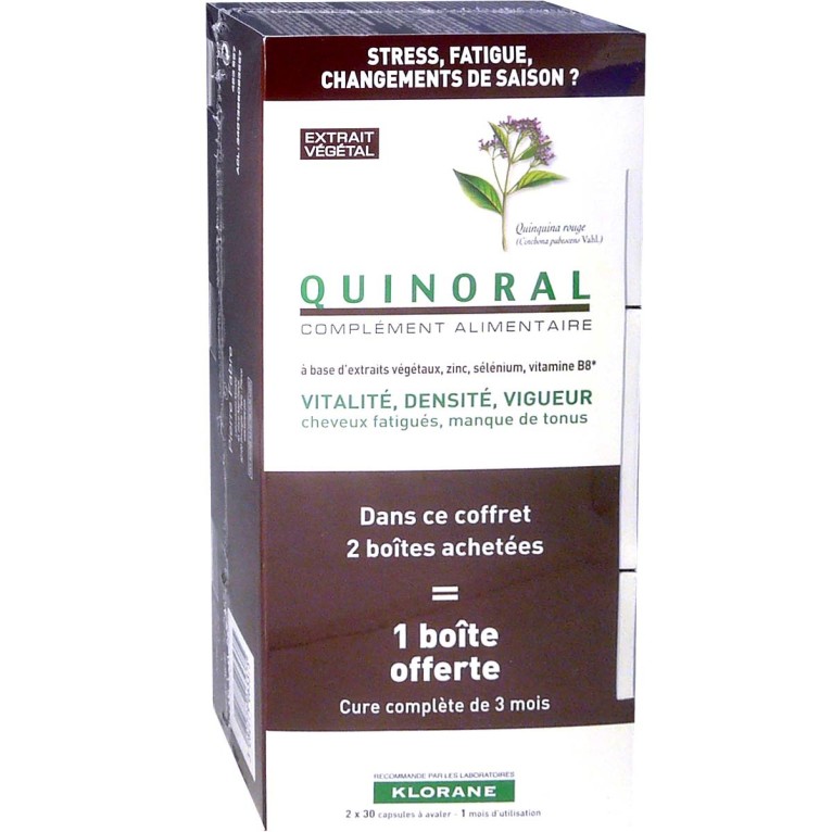 Quinoral Cure complète de KLORANE discount, un complément alimentaire fortifiant dans votre parapharmacie à prix discount, pour redonner aux cheveux dévitalisés, fatigués et ternes, force et beauté en 3 mois.
