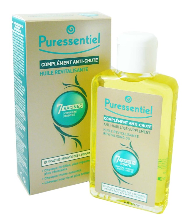 La gamme Anti-chute Cheveux de PURESSENTIEL à base d’acitfs 100% d’origine naturelle, est destinée aux hommes et aux femmes ayant une perte de cheveux chronique ou réactionnelle, pour redonner densité et brillance.L’huile revitalisante renforce les résultats du sérum traitant anti-chute de PURESSENTIEL. Composée d’un complexe breveté aux 7 racines, d’huiles essentielles et végétale, l’huile revitalisante nourrit intensément le cheveu de la racine jusqu’à la pointe, sculpte le cheveu sans agresser le cuir chevelu, et diminue les pellicules et les démangeaisons du cuir chevelu.Le complément anti-chute huile revitalisante peut être également utilisé comme masque capillaire.Après le soin, les cheveux sont doux et brillants.Dès 6 semaines, la chute est ralentie, en 3 mois les résultats sont visibles : la chevelure retrouve du volume, de la densité et de la vigueur.
