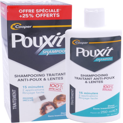 Shampooing traitant anti-poux et lentes POUXIT à prix discount des laboratoires COOPER, le shampooing qui lutte contre la prolifération des poux et les tue tout en nettoyant les cheveux en seulement 2 utilisations de 15 minutes. A partir de 6 mois.