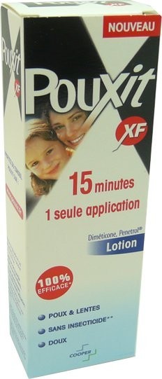 La formule de la lotion anti-poux Pouxit XF composée de diméticone (4%) et dePenetrol sans insecticides, étouffe les poux et les lentes ce qui les élimine. Le Penetrol permet une efficacité beaucoup plus efficace en venant en complément du Diméticone en pénétrant plus rapidement dans les orifices des lentes et des poux. En 15 minutes seulement et 1 seule application, la tête est débarrassée de parasites.