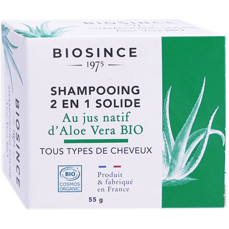 Le Shampooing Solide 2 en 1 Aloe vera Bio BIOSINCE discount des laboratoires GRAVIER, les multiples bienfaits du jus natif d’Aloe vera dans votre parapharmacie en ligne à prix discount, dans soin d’hygiène capillaire hydratant et démêlant écologique et économique, délicatement parfumé. Pour tous types de cheveux